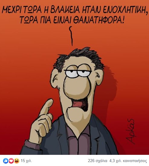 Η ατομική ευθύνη σε τέτοιες καταστάσεις μάλλον θεωρείται δυσεύρετο αγαθό. Το εν λόγω σκίτσο του Αρκά, μέσα σε μόλις 11 λεπτά από τη δημοσίευσή του είχε 6,2 χιλιάδες likes, 67 σχόλια και 1,7 χιλιάδες κοινοποιήσεις.