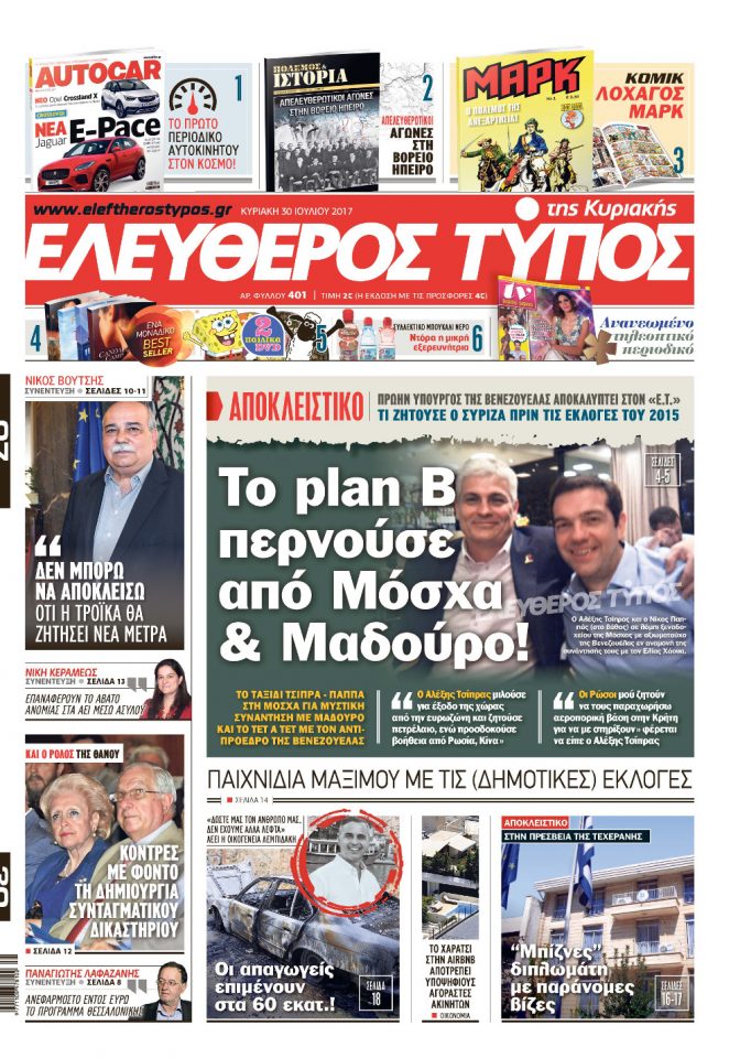 Όπως αποκαλύπτει στον Ελεύθερο Τύπο πρώην υπουργός της κυβέρνησης της Βενεζουέλας, που συμμετείχε ενεργά στις συζητήσεις εκείνης της περιόδου μεταξύ ΣΥΡΙΖΑ και Βενεζουέλας, ο Αλέξης Τσίπρας πριν ακόμη γίνουν οι εκλογές φέρεται να «μιλούσε για έξοδο της χώρας από την ευρωζώνη» ως επιλογή του ΣΥΡΙΖΑ, προσδοκώντας «στήριξη από τη Βενεζουέλα, τη Ρωσία και την Κίνα».