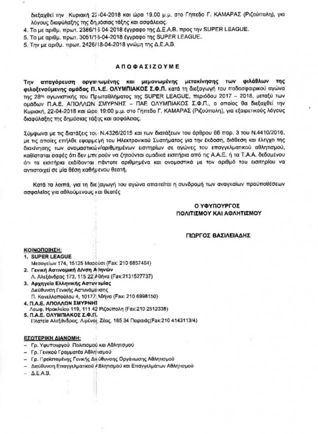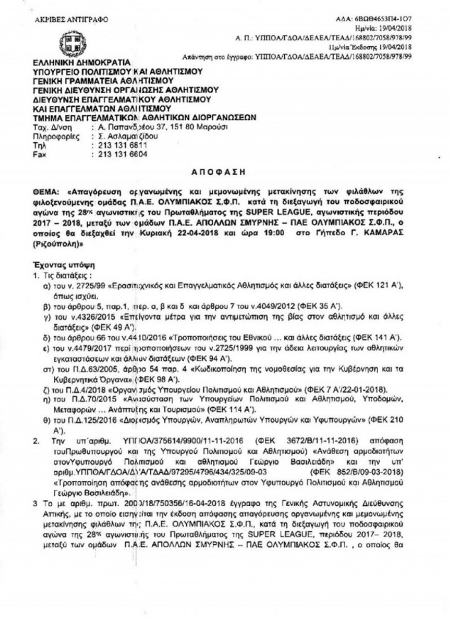 Με το σχετικό έγγραφο που κοινοποιήθηκε στην Super League, την Αστυνομία και τις δύο ΠΑΕ, τονίζεται ότι απαγορεύεται τόσο η οργανωμένη όσο και η μεμονωμένη μετακίνησή τους.