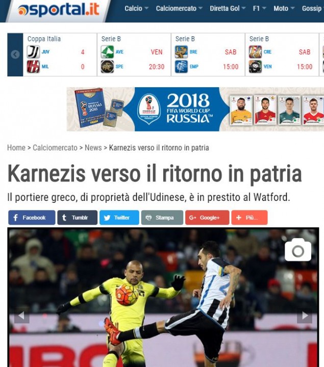 Οι Ιταλοί αναφέρουν χαρακτηριστικά: «Ο Έλληνας τερματοφύλακας έχει συμβόλαιο με την ιταλική ομάδα ως το 2019, αλλά αναμένεται μια επιστροφή στο σπίτι: Ο Ολυμπιακός ενδιαφέρεται και φέτος μετά από σερί κατακτήσεις έχασε το ελληνικό πρωτάθλημα. Ο Καρνέζης έχει ήδη δεχτεί την πρόταση και η Ουντινέζε για τη μεταγραφή θα βάλει στα ταμεία της 1,5 με 2 εκατομμύρια ευρώ».