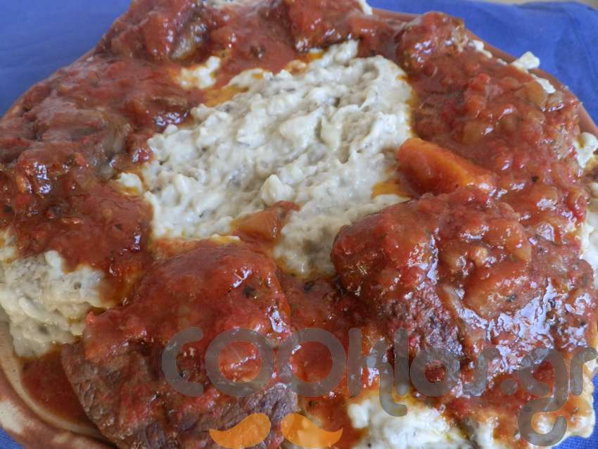 Σερβίρουμε τον πουρέ μελιτζάνας με το κοκκινιστό.