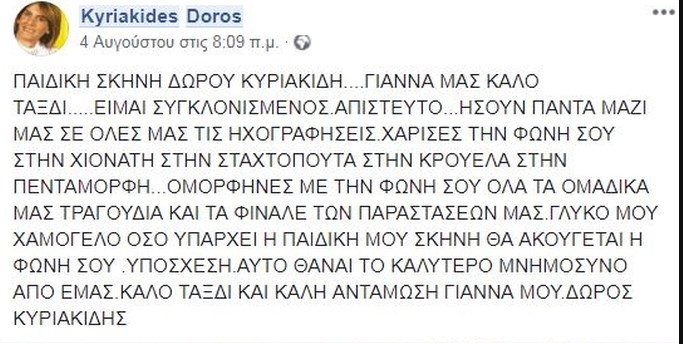 «ΠΑΙΔΙΚΗ ΣΚΗΝΗ ΔΩΡΟΥ ΚΥΡΙΑΚΙΔΗ….ΓΙΑΝΝΑ ΜΑΣ ΚΑΛΟ ΤΑΞΔΙ…..ΕΙΜΑΙ ΣΥΓΚΛΟΝΙΣΜΕΝΟΣ.ΑΠΙΣΤΕΥΤΟ…ΗΣΟΥΝ ΠΑΝΤΑ ΜΑΖΙ ΜΑΣ ΣΕ ΟΛΕΣ ΜΑΣ ΤΙΣ ΗΧΟΓΡΑΦΗΣΕΙΣ.ΧΑΡΙΣΕΣ ΤΗΝ ΦΩΝΗ ΣΟΥ ΣΤΗΝ ΧΙΟΝΑΤΗ ΣΤΗΝ ΣΤΑΧΤΟΠΟΥΤΑ ΣΤΗΝ ΚΡΟΥΕΛΑ ΣΤΗΝ ΠΕΝΤΑΜΟΡΦΗ…ΟΜΟΡΦΗΝΕΣ ΜΕ ΤΗΝ ΦΩΝΗ ΣΟΥ ΟΛΑ ΤΑ ΟΜΑΔΙΚΑ ΜΑΣ ΤΡΑΓΟΥΔΙΑ ΚΑΙ ΤΑ ΦΙΝΑΛΕ ΤΩΝ ΠΑΡΑΣΤΑΣΕΩΝ ΜΑΣ.ΓΛΥΚΟ ΜΟΥ ΧΑΜΟΓΕΛΟ ΟΣΟ ΥΠΑΡΧΕΙ Η ΠΑΙΔΙΚΗ ΜΟΥ ΣΚΗΝΗ ΘΑ ΑΚΟΥΓΕΤΑΙ Η ΦΩΝΗ ΣΟΥ .ΥΠΟΣΧΕΣΗ.ΑΥΤΟ ΘΑ ΝΑΙ ΤΟ ΚΑΛΥΤΕΡΟ ΜΝΗΜΟΣΥΝΟ ΑΠΟ ΕΜΑΣ.ΚΑΛΟ ΤΑΞΔΙ ΚΑΙ ΚΑΛΗ ΑΝΤΑΜΩΣΗ ΓΙΑΝΝΑ ΜΟΥ.ΔΩΡΟΣ ΚΥΡΙΑΚΙΔΗΣ».