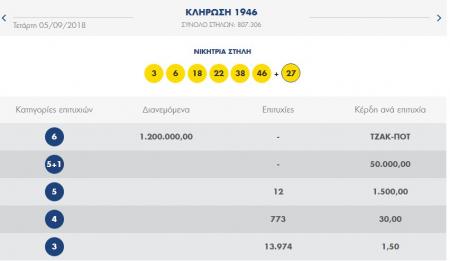 Πραγματοποιήθηκε η κλήρωση του ΛΟΤΤΟ (1946) την Τετάρτη 5 Σεπτεμβρίου που μοιράζει πάνω από 1 εκατ. ευρώ.