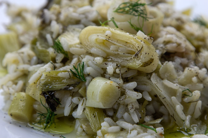 - Προσθέτουμε το ρύζι στα πράσα κι ανακατεύουμε τακτικά να μην κολλήσει.