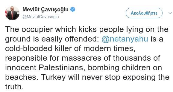 Ο Τούρκος υπουργός Εξωτερικών Μεβλούτ Τσαβούσογλου χαρακτήρισε τον Μπέντζαμιν Νετανιάχου «ψυχρό δολοφόνο της εποχής μας», με μία ανάρτηση στο twitter.
