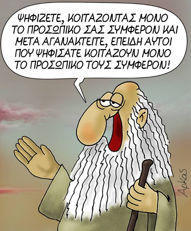 “Ψηφίζετε, κοιτάζοντας μόνο το προσωπικό σας συμφέρον και μετά αγανακτείτε, επειδή αυτοί που ψηφίσατε κοιτάζουν μόνο το προσωπικό τους συμφέρον” έγραψε ο Αρκάς στο νέο του σκίτσο.