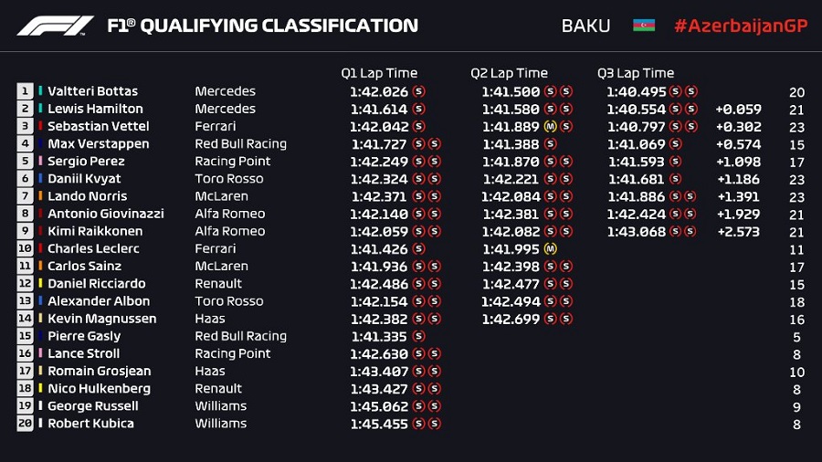 Ο Φινλανδός οδηγός της Mercedes στην τελευταία προσπάθεια έκανε τον καλύτερο χρόνο και θα εκκινήσει πρώτος στο 4ο γκραν πρι της Formula 1 για τη φετινή σεζόν, αφήνοντας δεύτερο τον «ομόσταυλό» του Βρετανό. Την πρώτη τριάδα συμπληρώνει ο Σεμπάστιαν Φέτελ με Φεράρι, σε μία διαδικασία κατατακτήριων αρκετά επεισοδιακή, καθώς είχαν ατυχήματα οι Λεκλέρ και Κουμπίτσα, ενώ εκτός έμειναν οι Χούκλενμπεργκ και Γκροζάν.