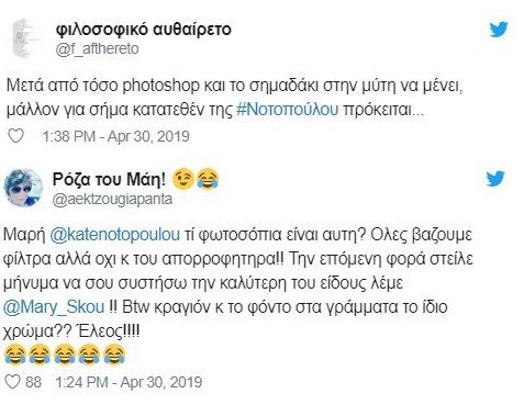 Viral έγινε στο ίντερνετ μια φωτογραφία της Κατερίνας Νοτοπούλου, καθώς σύμφωνα πάντα με τους χρήστες του Twitter, “έσβησε” κάθε μικρή ατέλεια και εμφανίστηκε με πορσελάνινη επιδερμίδα, «γκρεμίζοντας» τη φυσικότητα της φωτογραφίας. Πολλοί ήταν αυτοί που σχολίασαν ιδιαιτέρως μία απίστευτη λεπτομέρεια που παρατήρησαν στο πρόσωπό της και όπως δήλωσαν στα tweet τους είναι η απόδειξη ότι το παράκανε με το photoshop.