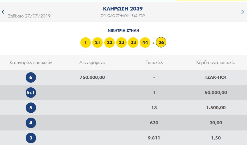 ΛΟΤΤΟ κλήρωση (27/7/19): Πραγματοποιήθηκε η κλήρωση του Λόττο (2039) που μοιράζει πάνω από 750.000 ευρώ στους τυχερούς της πρώτης κατηγορίας. Οι τυχεροί αριθμοί της σημερινής κλήρωσης του ΛΟΤΤΟ (2039 27/7/19) είναι οι:  1, 21, 22, 23, 33, 44 και Bonus ο αριθμός 26.