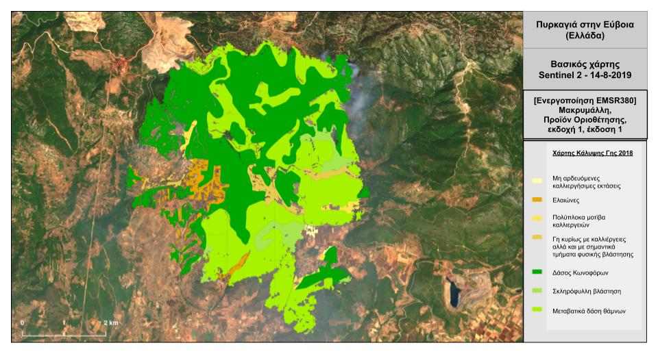 - Έναν Χάρτη Οριοθέτησης (Delineation Map), με την περιοχή που έχει πληγεί,. Αυτός ο χάρτης δεν αντικαθιστά τον τοπογραφικό στον οποίο θα βασιστούν αρχές, ασφαλιστικές εταιρείες κλπ, για να δώσουν τυχόν αποζημιώσεις, καθώς μπορεί να υπάρχουν αποκλίσεις. Δίνει, όμως, τη μέγιστη δυνατή πληροφορία που μπορούν να συλλέξουν οι δορυφόροι για να βοηθήσουν τις αρχές να επέμβουν δραστικά.