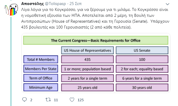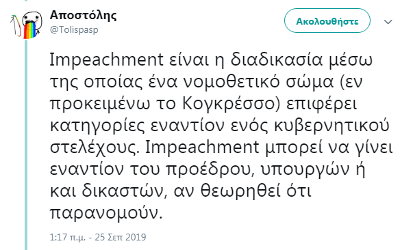 Πριν από λίγες ημέρες ξεκίνησε με αρκετά ενημερωτικά tweets που αφορούν στη λειτουργία του Κογκρέσου, αλλά και σε όλη τη διαδικασία του Impeachment που ξεκίνησε κατά του Τραμπ. Σε όλες τους τις αναρτήσεις είναι επεξηγηματικός και πάντα καταφέρνει να λύνει απορίες σε όλους εκείνους που επισκέπτονται τον λογαριασμό του για τον διαβάσουν.