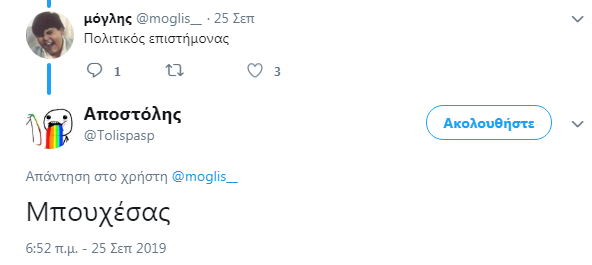 Βέβαια δεν είναι μόνο ένας άνθρωπος καθαρά στοχοπροσηλωμένος σε τέτοιου είδους αναρτήσεις, αλλά κάνει και αρκετά αστεία retweets από άλλους χρήστες για να «σπάει την μονοτονία» των υπόλοιπων δημοσιεύσεων του. Επίσης δεν θα μπορούσε να μην αστειευτεί με ακολούθους του. Συγκεκριμένα κάποιος τον ρώτησε αν είναι πολιτικός επιστήμονας με εκείνον να του απαντά «μπουχέσας».