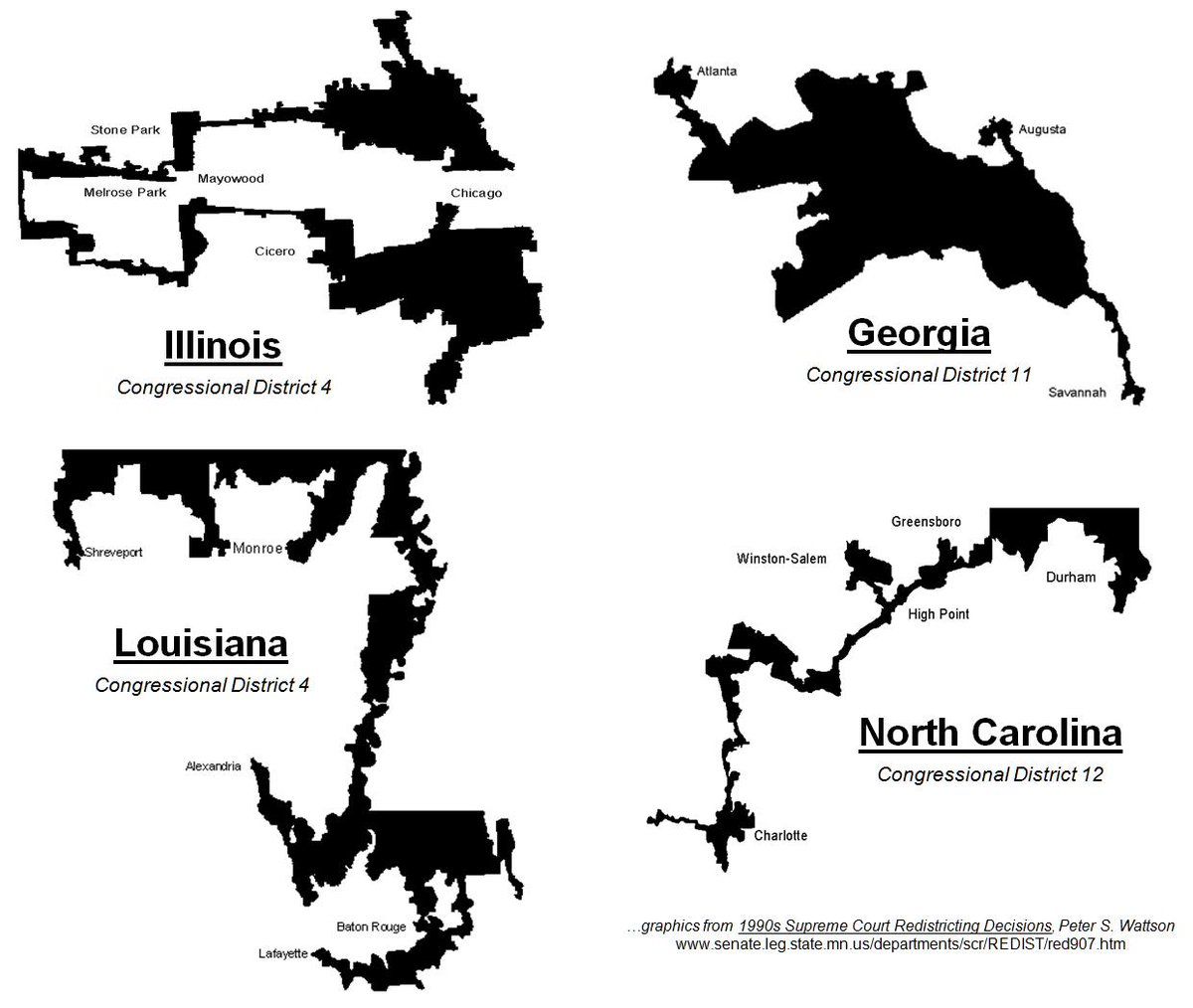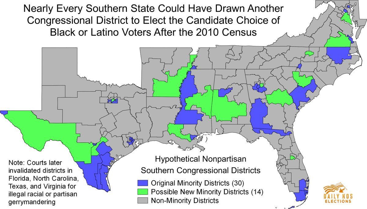 Επισημαίνεται ότι στο αμερικάνικο νότο υπάρχει και ο ρατσισμός. Στις μπλε περιφέρειες ζουν κατά πλειοψηφία μαύροι και ελέγχονται οπότε από τους Δημοκράτες (οι μαύροι ψηφίζουν 90% τους Δημοκράτες). Με τίμια σύνορα, θα έπρεπε να ελέγχουν και τις πράσινες. Όμως λόγω της ψήφου των μαύρων που δεν επιθυμούν να στηρίξουν τους Ρεπουμπλικάνους πνίγονται λόγω του gerrymandering στις πράσινες περιφέρειες και αντιπροσωπεύονται από λευκούς Ρεπουμπλικάνους βουλευτές ενώ η πλειοψηφία των κατοίκων είναι μαύροι Δημοκρατικοί.