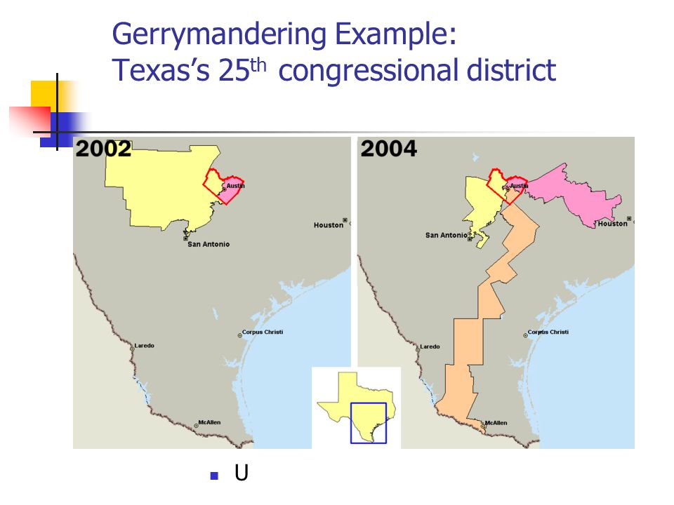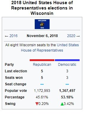 Ένα ακόμα τρανό παράδειγμα είναι όταν στις περυσινές βουλευτικές εκλογές στη πολιτεία του Wisconsin, οι Δημοκρατικοί πήραν το 53% των ψήφων χωρίς να έχουν την πλειοψηφία των εδρών, συγκεκριμένα διέθεταν μόνο το 3/8 εξαιτίας του gerrymandering.