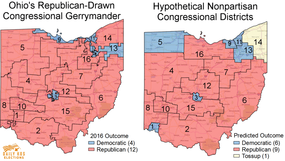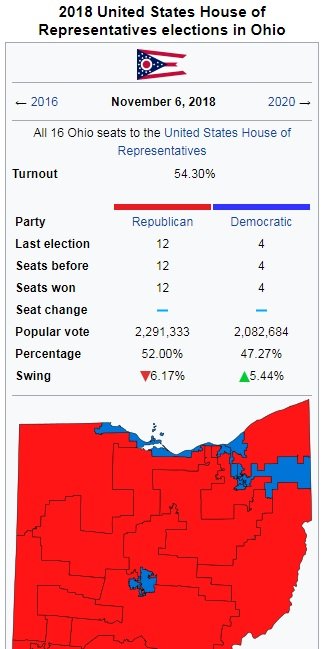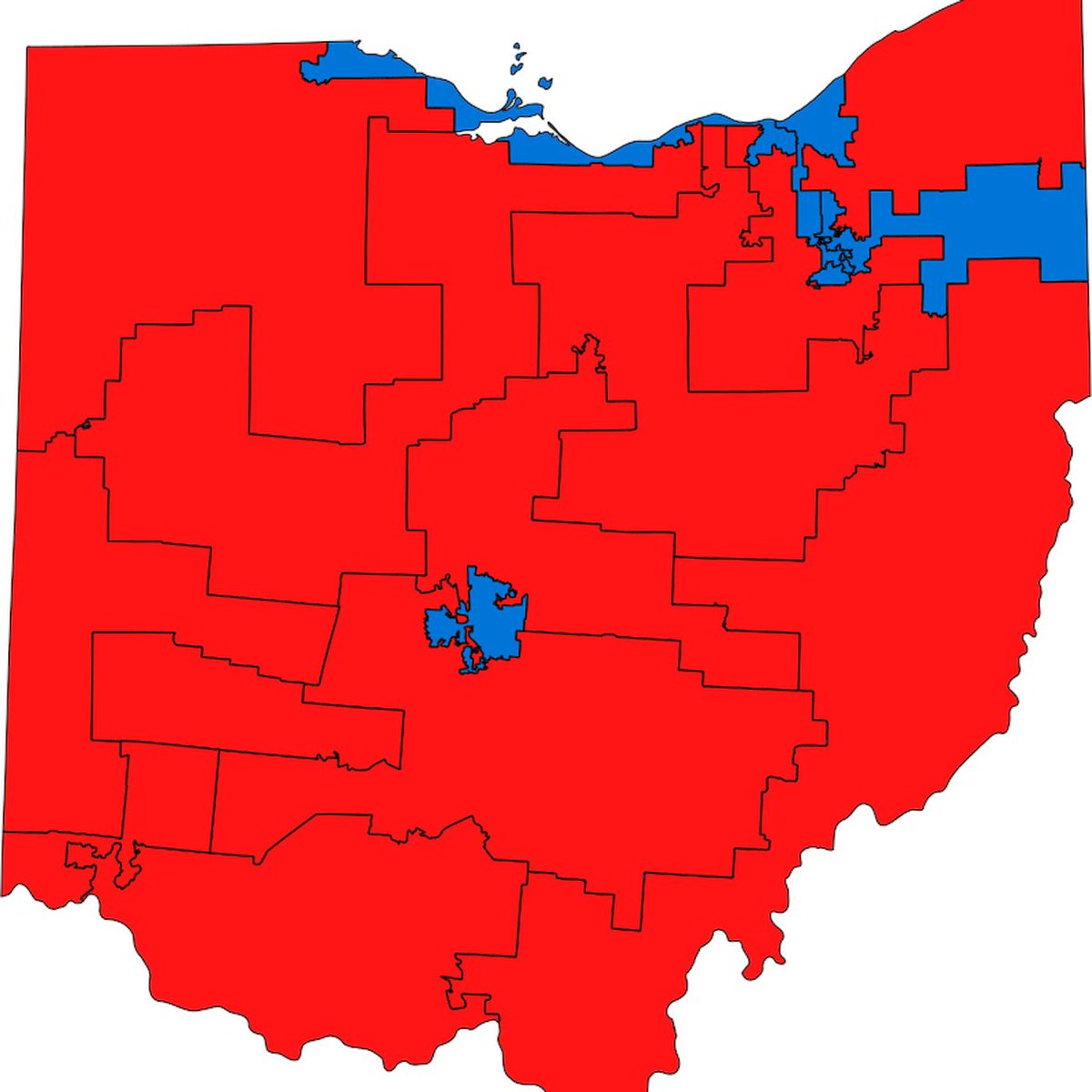 Παράδειγμα η πολιτεία του Ohio που ελέγχεται από τους Ρεπουμπλικάνους (Τραμπ, κόκκινο χρώμα) είναι μια περιοχή που είναι αμφισβητούμενη η συμμετοχή στις προεδρικές εκλογές. Ο Ομπάμα την είχε κερδίσει δύο φορές αλλά οι Δημοκρατικοί έχουν μόνο 4 από τις συνολικά 16 έδρες.