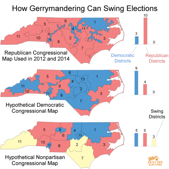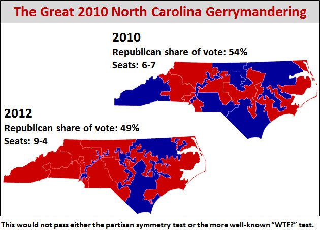 Μόλις αλλάζει η δεκαετία το κόμματα τρέχουν να αλλάξουν τον χάρτη προκείμενου να ευνοηθούν κερδίζοντας έδρες. Στη παρακάτω φωτογραφία, η North Carolina, της οποίας οι έδρες πήγαν μέσα 2 χρόνια από κατανομή 6-7 σε 9-4 υπέρ του Τραμπ (που δεν πήραν ούτε 50%). Έτσι φαίνεται ότι οποιοδήποτε αποτέλεσμα μπορεί να έρθει τούμπα. Να σημειωθεί ότι μερικοί από αυτούς του χάρτες βρίσκονται στα δικαστήρια. Ο χάρτης που χρησιμοποιούνταν μέχρι και πέρυσι για τη North Carolina κρίθηκε αντισυνταγματικός και απορρίφθηκε.