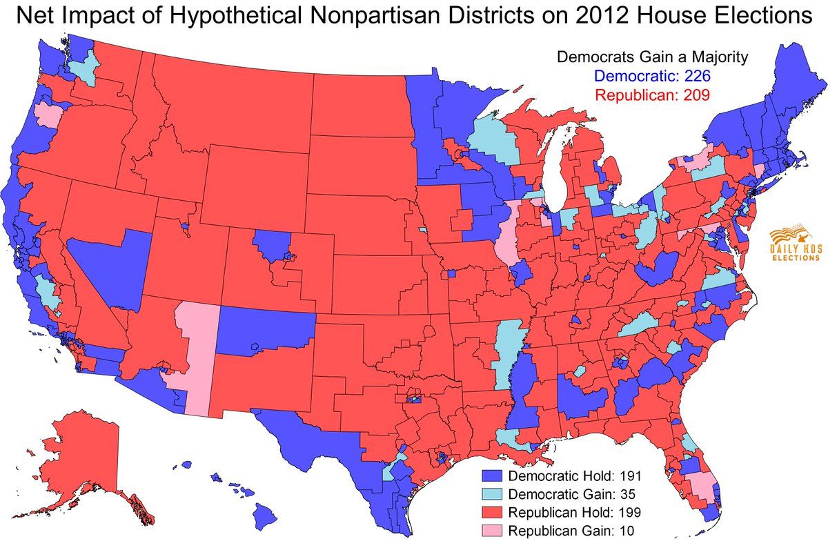 Αν κάποια στιγμή το gerrymandering κρίνονταν παράνομο και όλους τους χάρτες δημιουργούσε μια ανεξάρτητη αρχή ή τα δικαστήρια τότε ο Ομπάμα το 2012 θα είχε 226 έδρες (πλειοψηφία) ενώ τελικά έλαβε 201 έδρες που σημαίνει μειοψηφία.