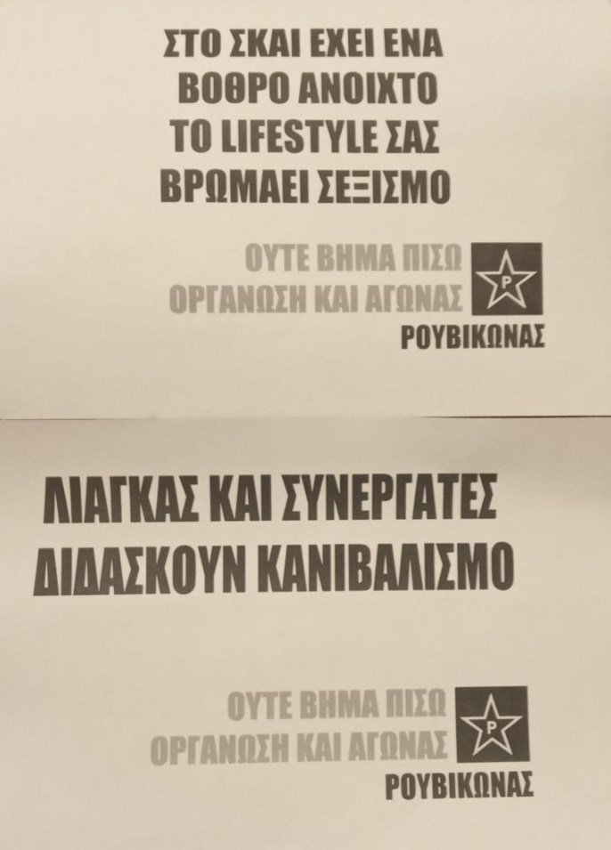 Ρουβίκωνας: Με κείμενο που έχει αναρτηθεί σε γνωστή σελίδα του αντιεξουσιαστικού χώρου, ο Ρουβίκωνας ανακοινώνει την «παρέμβαση» στο σπίτι του Γιώργου Λιάγκα, από τον «Φεμινιστικό Τομέα» της ομάδας. Στο κείμενο, καυτηριάζεται η στάση που κράτησε τόσο ο ίδιος ο παρουσιαστής, όσο και το πάνελ του στην εκπομπή του ΣΚΑΪ, σχετικά με την σοκαριστική υπόθεση που σημειώθηκε στην βιβλιοθήκη του ΑΠΘ, στην Θεσσαλονίκη, όπου ένας φοιτητής εκσπερμάτισε στην πλάτη μιας φοιτήτριας που διάβαζε αμέριμνη. Ο Ρουβίκωνας με αιχμηρό τρόπο κάνει λόγο για «lifestyle κουτσομπολιά, ματιές από την κλειδαρότρυπα, ρατσισμό, σεξισμό», στηλιτεύοντας τα όσα συνέβησαν στον τηλεοπτικό «αέρα».