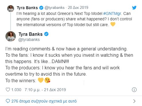 Τάιρα Μπανκς: Η Τάιρα Μπανκς είναι πασίγνωστη Αμερικανίδα μοντέλο και παρουσιάστρια, η οποία έχει συνδεθεί στο 100% με το ANTM δηλαδή το αμερικανικό Next Top Model. Για να καταλάβετε τι εννοούμε θα χρησιμοποιήσουμε μια… μάλλον αδόκιμη φράση λέγοντας πως είναι η Βίκυ Καγιά της Αμερικής. Τα προβλήματα στον τελικό του GNTM έφτασαν μέχρι και τα δικά της αυτιά. Φανταστείτε πόσο μεγάλο ήταν το πρόβλημα για ένα τέτοιο σόου.