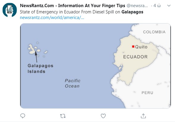 Ισημερινός: Οι αρχές του Ισημερινού ενεργοποίησαν χθες Κυριακή σχέδιο αντιμετώπισης κατάστασης εκτάκτου ανάγκης μετά το ναυάγιο σε λιμάνι των νήσων Γκαλαπάγκος φορτηγίδας με περίπου 2.300 λίτρα ντίζελ, καύσιμο που σχημάτισε κηλίδα και απειλεί το εύθραυστο οικοσύστημα του αρχιπελάγους, μέρους της Παγκόσμιας Φυσικής Κληρονομιάς της Ανθρωπότητας. Προσωπικό του στρατού και της υπηρεσίας προστασίας του περιβάλλοντος έστησε «φράγματα περιορισμού» της κηλίδας και άπλωσε «απορροφητικά υφάσματα» για να μειωθεί «ο κίνδυνος για το περιβάλλον εξαιτίας του ναυαγίου της φορτηγίδας Orca», ανέφερε μέσω Twitter το Εθνικό Πάρκο Γκαλαπάγκος, ο φορέας ο οποίος είναι αρμόδιος για την προστασία των νησιών.