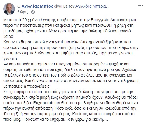 “Μετά από 20 χρόνια έγγαμης συμβίωσης με την Ευαγγελία Δαμιανάκη και παρά τις προσπάθειες που κατέβαλα μήπως κάτι περισωθεί, η ρήξη στη μεταξύ μας σχέση είναι πλέον οριστική και αμετάκλητη, εδώ και αρκετό καιρό. Και αν το δημοσιοποιώ είναι γιατί πιστεύω ότι σημαντικά ζητήματα που αφορούν ακόμη και την προσωπική ζωή ενός προσώπου, που τέθηκε στην κρίση των συμπολιτών του και τιμήθηκε από αυτούς, πρέπει να γίνονται γνωστά.