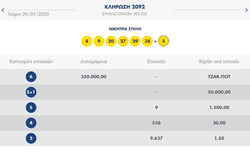 ΛΟΤΤΟ κλήρωση [29/1/20]: Πραγματοποιήθηκε η κλήρωση του ΛΟΤΤΟ (2092) που μοιράζει περισσότερα από 300.000 ευρώ στους τυχερούς της πρώτης κατηγορίας. Οι τυχεροί αριθμοί της σημερινής κλήρωσης του ΛΟΤΤΟ είναι οι: 8, 9, 20, 27, 29, 38 και Bonus ο αριθμός 5.