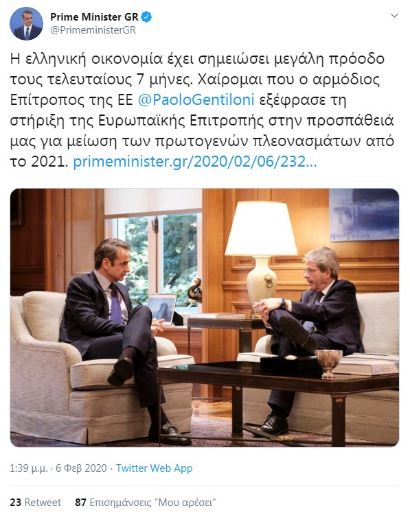 Αργότερα, ο πρωθυπουργός θέλησε να αφήσει ένα σχόλιο για τη συνάντηση αυτή και επέλεξε να το κάνει στα social media. «Η ελληνική οικονομία έχει σημειώσει μεγάλη πρόοδο τους τελευταίους 7 μήνες. Χαίρομαι που ο αρμόδιος Επίτροπος της ΕΕ @PaoloGentiloni εξέφρασε τη στήριξη της Ευρωπαϊκής Επιτροπής στην προσπάθειά μας για μείωση των πρωτογενών πλεονασμάτων από το 2021», αναφέρει ο πρωθυπουργός, Κυρ. Μητσοτάκης σε ανάρτησή του στο twitter.