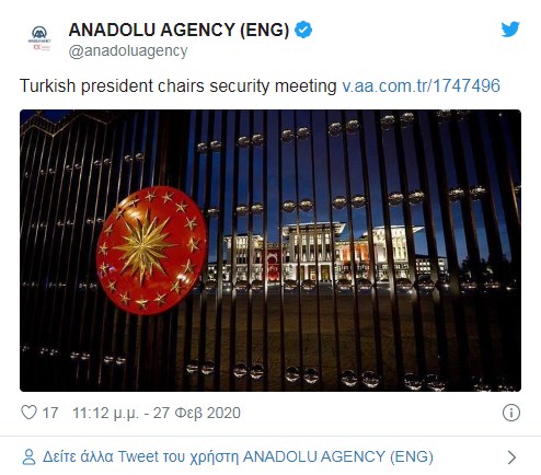 Έκτακτη στρατιωτική σύσκεψη συγκάλεσε απόψε ο Τούρκος πρόεδρος, Ρετζέπ Ταγίπ Ερντογάν, στο Λευκό Παλάτι, για τις τελευταίες εξελίξεις στο Ιντλίμπ της Συρίας. Στη σύσκεψη, που πραγματοποιείται υπό την προεδρία του Ταγίπ Ερντογάν, συμμετέχουν ο υπουργός Άμυνας Χουλουσί Ακάρ, ο αρχηγός των μυστικών υπηρεσιών, Χακάν Φιντάν, ο υπουργός Εξωτερικών, Μεβλούτ Τσαβούσογλου και ανώτατοι αξιωματικοί του Στρατού.