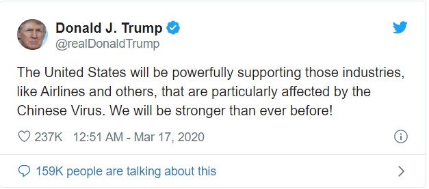 Ντόναλντ Τραμπ Κορωνοϊός: Χθες ο Αμερικανός πρόεδρος ανήρτησε στο Twitter: «Οι ΗΠΑ θα στηρίξουν ενεργά τις βιομηχανίες αυτές, όπως τις αεροπορικές εταιρείες και άλλες, που επηρεάζονται ιδιαίτερα από τον Κινεζικό Ιό. Θα είμαστε πιο ισχυροί από ποτέ!». Μέλη της αμερικανικής κυβέρνησης έχουν ήδη χρησιμοποιήσει αντίστοιχες εκφράσεις, όμως μέχρι στιγμής ότι ο ίδιος ο Τραμπ.