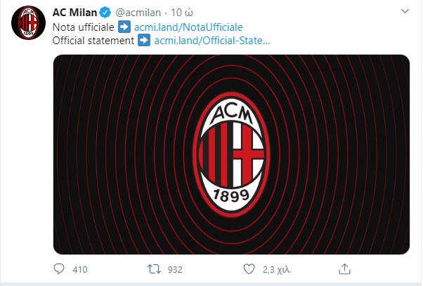 «Η Μίλαν επιβεβαιώνει ότι ο τεχνικός διευθυντής του συλλόγου, Πάολο Μαλντίνι, αφού ήρθε σε επαφή με ένα άτομο που ακολούθως διαπιστώθηκε θετικός στον κορονοϊό, άρχισε να εμφανίζει τα ίδια συμπτώματα του ιού. Αφού υποβλήθηκε σε εξετάσεις, τα αποτελέσματα βγήκαν θετικά. Ο γιος του Ντάνιελ, παίκτης της μικρής ομάδας που προπονούνταν και με την πρώτη ομάδα, διαπιστώθηκε θετικός.