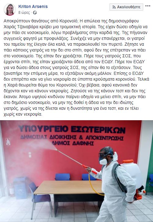 “Αποκρύπτουν θανάτους από Κορονοϊό; Η απώλεια της δημοσιογράφου Χαράς Τζαναβάρα κρύβει μια τρομακτική ιστορία. Της είχαν δώσει οδηγία να μην πάει σε νοσοκομείο, λόγω προβλήματος στην καρδιά της.Της πήγαιναν συγγενείς φαγητό με προφυλάξεις. Συνέχιζε να μην επανέρχεται, οι γιατροί του ταμείου της έλεγαν όλα καλά, να παρακολουθεί τον πυρετό. Ζήτησε να πάει κάποιος γιατρός να την δει στο σπίτι, αφού δεν της επέτρεπαν να πάει στο νοσοκομείο. Της είπαν δεν χρειάζεται.