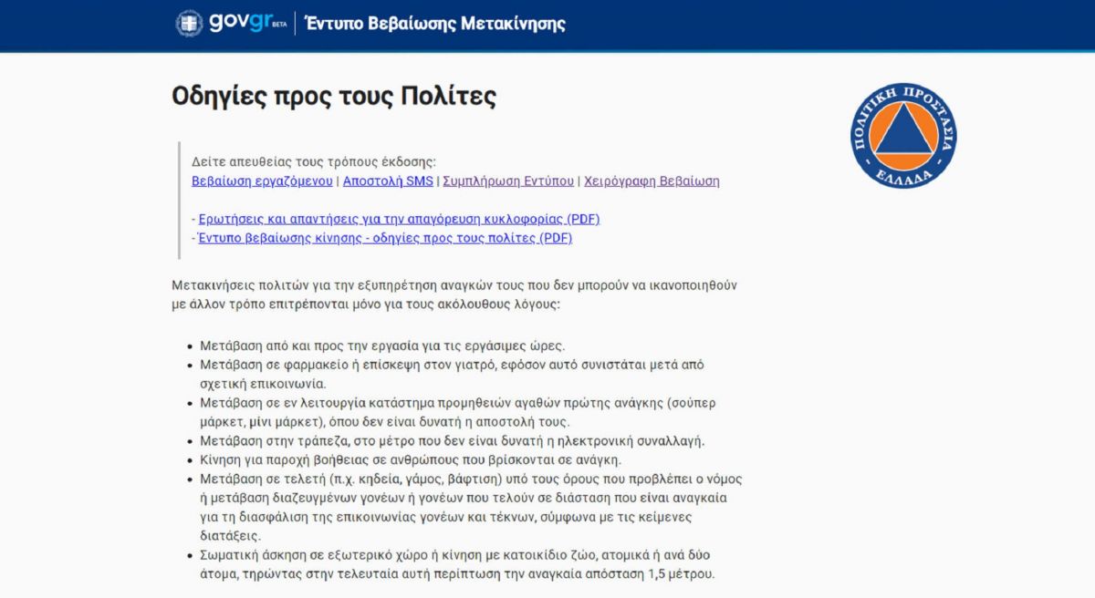 Σε κάθε μετακίνηση πρέπει οι πολίτες να έχουν μαζί τους την αστυνομική τους ταυτότητα ή διαβατήριο καθώς και συμπληρωμένο έντυπο βεβαίωσης κίνησης (εκτυπωμένο ή χειρόγραφο) ή το SMS επιβεβαίωσης, για να το επιδείξουν σε περίπτωση ελέγχου.