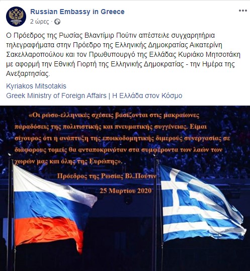 25η Μαρτίου: Ο Πρόεδρος της Ρωσίας Βλαντίμιρ Πούτιν απέστειλε συγχαρητήρια τηλεγραφήματα στην Πρόεδρο της Ελληνικής Δημοκρατίας Αικατερίνη Σακελλαροπούλου και τον πρωθυπουργό της Ελλάδας Κυριάκο Μητσοτάκη με αφορμή την Εθνική Γιορτή της Ελληνικής Δημοκρατίας – την Ημέρα της Ανεξαρτησίας, όπως κάνει γνωστό με ανάρτησή της στο Facebook η ρωσική πρεσβεία στην Ελλάδα.