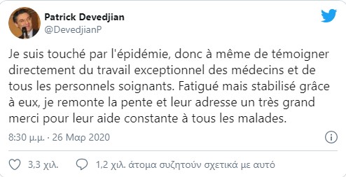 Στα τελευταία του μηνύματα ο Πατρίκ Ντεβεντζιάν είχε συγκλονίσει ευχαριστώντας το ιατρικό προσωπικό: «έχω χτυπηθεί από την επιδημία… Είμαι κουρασμένος, αλλά έχω σταθεροποιηθεί χάρη αυτών, ανεβαίνω την ανηφόρα και τους απευθύνω ένα τεράστιο ευχαριστώ για την συνεχή προσφορά τους σε όλους τους ασθενείς», έγραψε στις 26 Μαρτίου, λίγο πριν πεθάνει.