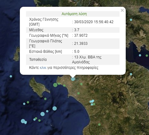 Σεισμός τώρα: Σεισμική δόνηση 3,7 Ρίχτερ ταρακούνησε το απόγευμα της Δευτέρας την Αμαλιάδα. Σύμφωνα με την μέτρηση του Γεωδυναμικού Ινστιτούτου, ο σεισμός είχε εστιακό βάθος 5 χιλιομέτρων και το επίκεντρο εντοπίζεται 13 χιλιόμετρα βόρεια βορειοανατολικά της πόλης της Αμαλιάδας.