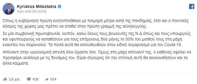 Γράφει ο πρωθυπουργός: «Όπως η κυβέρνηση πρώτη κινητοποιήθηκε με τολμηρά μέτρα κατά της πανδημίας, έτσι και ο πολιτικός κόσμος της χώρας μας πρέπει να σταθεί στην πρώτη γραμμή της αλληλεγγύης. Σε μία συμβολική πρωτοβουλία, λοιπόν, καλώ όλους τους βουλευτές της Ν.Δ όπως και τους υπουργούς και υφυπουργούς να καταθέσουν για τους επόμενους δύο μήνες το 50% του μισθού τους στη μάχη εναντίον του Κορονοϊού.