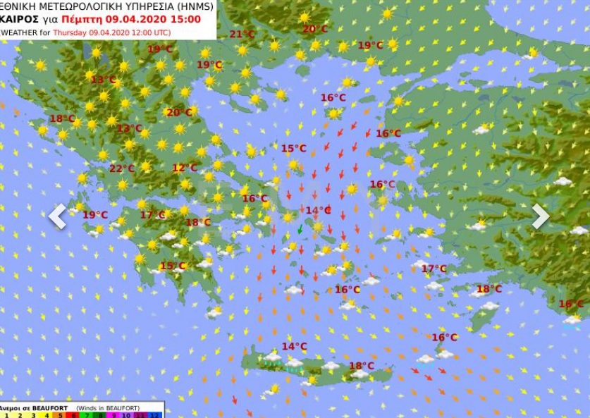 O καιρός την Πέμπτη 9 Απριλίου 2020 σύμφωνα με την πρόγνωση της Εθνικής Μετεωρολογικής Υπηρεσίας (ΕΜΥ): Στα Δωδεκάνησα και την Κρήτη παροδικές νεφώσεις με πρόσκαιρες τοπικές βροχές. Οι άνεμοι θα πνέουν από βόρειες διευθύνσεις, στα δυτικά 3 με 5 και στο βόρειο Ιόνιο από το απόγευμα τοπικά 6 μποφόρ. Στα ανατολικά 5 με 7 και στο Αιγαίο νωρίς το πρωί έως 8 μποφόρ, με βαθμιαία εξασθένηση από το απόγευμα. Η θερμοκρασία θα σημειώσει άνοδο ως προς τις μέγιστες τιμές.
