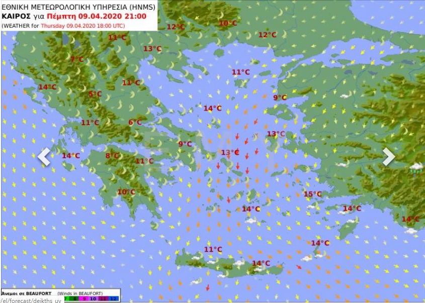 - Ανεμοι: Στα δυτικά βορειοδυτικοί 3 με 4 μποφόρ και βαθμιαία μεταβλητοί ασθενείς. Στα ανατολικά βορειοανατολικοί 4 με 5 και πρόσκαιρα στα ανατολικά το πρωί 6 μποφόρ.