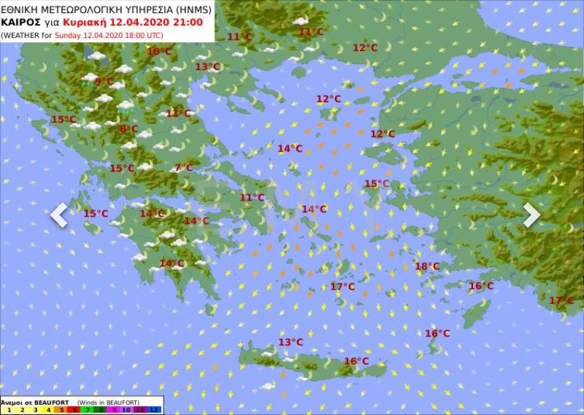 - Ανεμοι: Ανατολικοί βορειοανατολικοί 4 με 6 και στα Δωδεκάνησα 3 με 5 μποφόρ. Από το απόγευμα βόρειοι βορειοανατολικοί 4 με 6 μποφόρ με εξασθένηση τη νύχτα.