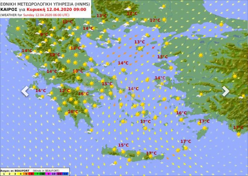 O καιρός την Κυριακή 12 Απριλίου 2020 σύμφωνα με την πρόγνωση της Εθνικής Μετεωρολογικής Υπηρεσίας (ΕΜΥ): Στα βορειοανατολικά νεφώσεις με σποραδικές βροχές μέχρι το απόγευμα. Στην υπόλοιπη χώρα γενικά αίθριος καιρός, αλλά τις μεσημβρινές και απογευματινές ώρες στα ηπειρωτικά θα αναπτυχθούν πρόσκαιρες νεφώσεις και θα εκδηλωθούν τοπικοί όμβροι κυρίως στα κεντρικά και βόρεια ορεινά. Τοπικά περιορισμένη ορατότητα στα δυτικά τις πρωινές και βραδινές ώρες. Οι άνεμοι στα δυτικά θα είναι μεταβλητοί 3 με 4, στα ανατολικά από βόρειες διευθύνσεις 4 με 6 και στο Αιγαίο κατά τόπους 7 μποφόρ, με βαθμιαία εξασθένηση από το μεσημέρι. Σε μικρή πτώση στα ανατολικά και βόρεια η θερμοκρασία.