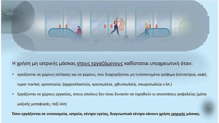 Η χρήση μη ιατρικής μάσκας στους εργαζόμενους καθίσταται υποχρεωτική όταν εργάζονται σε σούπερ μάρκετ χώρους εστίασης χώρους διαχείρισης μη τυποποημένων τροφίμων (κρεοπωλεία ιχθυοπωλεία, ζαχαροπλαστεία κ.α.) και σε οσους εργάζονται σε χώρους εργασίας στους οποίους δεν είναι δυνατόν να τηρηθούν οι αποστάσεις ασφαλείας (π.χ. μέσα μαζικής μεταφοράς). Όσοι εργάζονται σε νοσοκομεία ιατρεία κέντρα υγείας και διαγνωστικά κέντρα κάνουν χρήση ιατρικής μάσκας. Επισημαίνεται τέλος, ότι η χρήση μη ιατρικής μάσκας αποτελεί συμπληρωματικό μέτρο και δεν υποκαθιστά τους βασικούς κανόνες προστασίας.