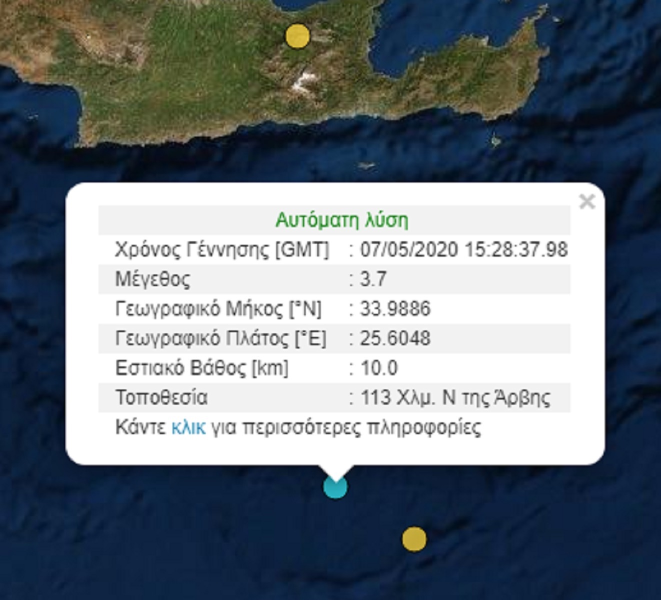 Σεισμός τώρα στην Κρήτη: Νέα σεισμική δόνηση σημειώθηκε το απόγευμα της Πέμπτης 7 Μαΐου. Σύμφωνα με την αυτόματη λύση του Γεωδυναμικού Ινστιτούτου του Εθνικού Αστεροσκοπείου Αθηνών η σεισμική δόνηση ήταν μεγέθους 3,7 βαθμών της κλίμακας Ρίχτερ. Το επίκεντρο του σεισμού εντοπίστηκε 113χλμ νότια της Άρβης, ενώ το εστιακό βάθος υπολογίζεται στα 10χλμ.