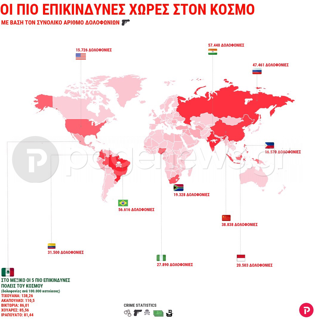 Και αυτό φαίνεται και στο μοναδικό infographic του pagenews.gr όπου η Βραζιλία κατέγραψε 56.616 δολοφονίες. Ενώ 31.500 δολοφονίες καταγράφηκαν στην Κολομβία. Η Βραζιλία όμως κατέχει την δεύτερη θέση γιατί την θλιβερή πρωτιά έχει η Ινδία με 57.440 ανθρωποκτονίες. Τρίτη χώρα σε καταγραφή δολοφονιών έρχεται η Ρωσία με 47.461 ανθρωποκτονίες.