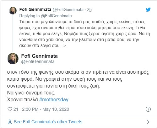 Τώρα που μεγαλώνουμε τα δικά μας παιδιά, χωρίς εκείνη, πόσες φορές έχω αναρωτηθεί είμαι τόσο καλή μητέρα όσο εκείνη; Τι θα έκανε, τι θα μου έλεγε; Νομίζω πως ξέρω, αγάπη χωρίς όρια. Να τη νιώθουν στο χάδι σου να τη βλέπουν στα μάτια σου, να την ακούν στα λόγια σου, στον τόνο της φωνής σου ακόμα κι αν πρέπει να είναι αυστηρός καμιά φορά. Να γραφτεί στην ψυχή τους και να τους συντροφεύει για πάντα στη δική τους ζωή. Να γίνει δύναμή τους. Χρόνια πολλά».
