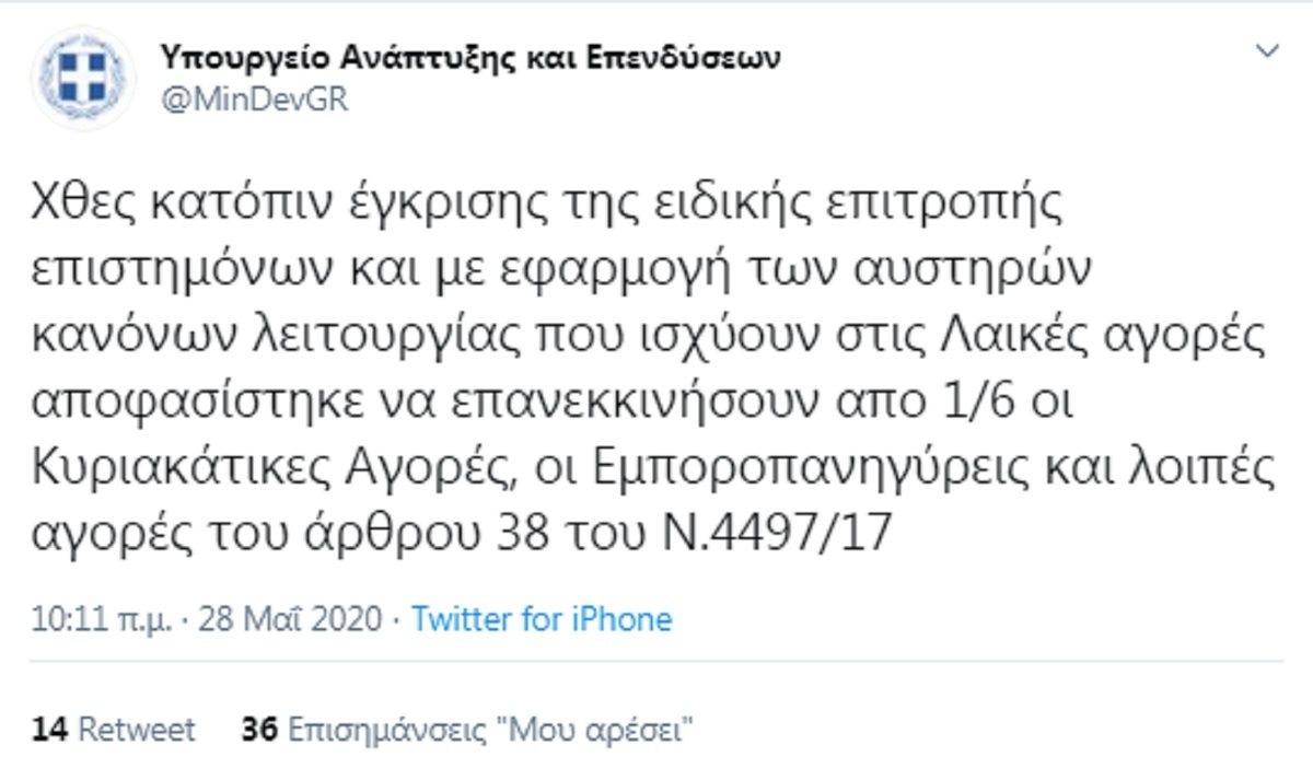 Θα ανοίξουν και πάλι από την 1 Ιουνίου οι εμποροπανυγύρεις, οι κυριακάτικες αγορές και λοιπές αγορές του άρθρου 38 του νόμου 4497/17, όπως έκανε γνωστό το υπουργείο Ανάπτυξης. Συγκεκριμένα με βάση τη σημερινή ανάρτηση του υπουργείου Ανάπτυξης και Επενδύσεων γράφτηκε στην κοινωνική πλατφόρμα του twitter: «…κατόπιν έγκρισης της ειδικής επιτροπής επιστημόνων και με εφαρμογή των αυστηρών κανόνων λειτουργίας που ισχύουν για τις λαϊκές αγορές επανεκκινούν από 1/6 οι Κυριακάτικες αγορές, οι εμποροπανηγύρεις και λοιπές αγορές του άρθρου 38 του νόμου 4497/17».