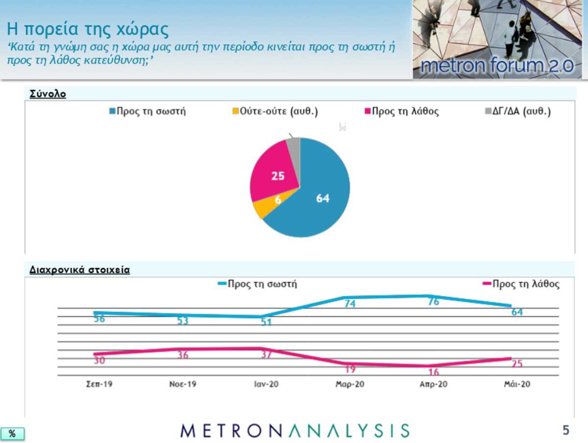 Το 64% των ερωτηθέντων λένε πως η χώρα κινείται προς την σωστή κατεύθυνση, με μόλις έναν στους τέσσερις να υποστηρίζουν το αντίθετο, ενώ μόλις το 6% απαντά ούτε το ένα, ούτε το άλλο. Ένα εύρημα που σαφώς συνδέεται άμεσα με το ζήτημα του κορωνοϊού, το οποίο και μονοπωλεί το ενδιαφέρον της κοινωνίας τους τελευταίους μήνες.