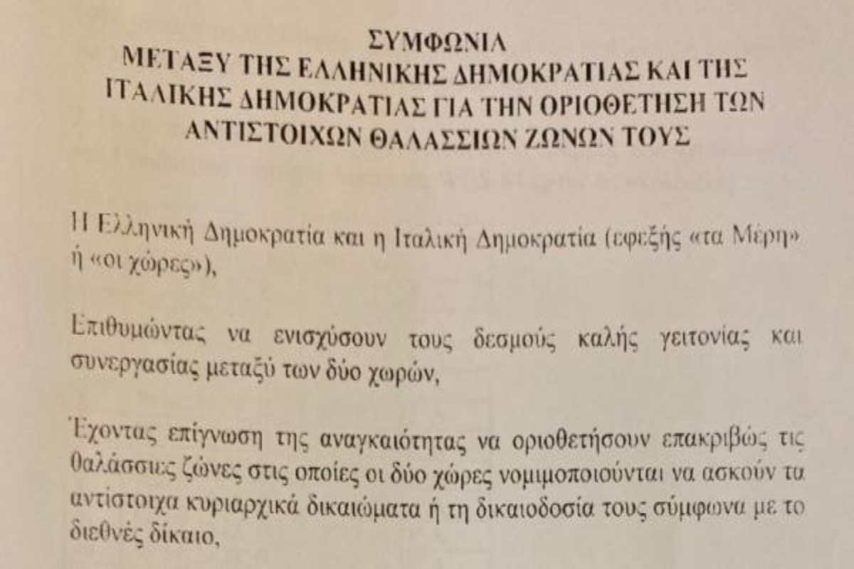 Λίγο πριν την έγκριση της Βουλής είναι η συμφωνία για την οριοθέτηση των θαλασσίων ζωνών Ελλάδας – Ιταλίας, το πλήρες κείμενο της οποίας και οι ακριβείς συντεταγμένες δόθηκαν στους τομεάρχες των κομμάτων χθες το απόγευμα. Μία συμφωνία η οποία όπως έχει υπογραμμισθεί επανειλημμένα από διπλωματικούς κύκλους αλλά και από την Πρωθυπουργό, Κυριάκο Μητσοτάκη, αναγνωρίζει κυριαρχικά δικαιώματα σε όλα τα εδάφη χερσαία και νησιωτικά, ανταποκρινόμενη πλήρως στους κανόνες του Διεθνούς Δικαίου αλλά και της Σύμβασης των Ηνωμένων Εθνών για το Δίκαιο της Θάλασσας, στέλνοντας σαφές μήνυμα προς κάθε κατεύθυνση για τη στρατηγική της Ελλάδας στην επίλυση αντίστοιχων θεμάτων, αλλά και στην πρόθεση για συνεννόηση στο πλαίσιο της καλής γειτονίας.