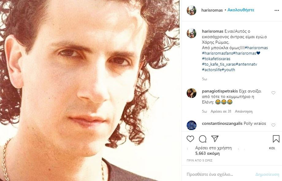 Σε αυτήν ποζάρει… μοιραίος στον φακό, έχοντας μακριά, σγουρά μαλλιά. «Ε,ναι! Αυτός ο εικοσάχρονος άντρας είμαι εγώ, ο Χάρης Ρώμας», είναι το σχόλιο που συνοδεύει την ανάρτησή του, την οποία οι followers του λάτρεψαν και για αυτό χάρισαν τα likes απλόχερα. Είναι άξιο αναφορά πως μέσα σε λιγότερο από 5 ώρες, η φωτογραφία είχε συγκεντρώσει πάνω από 5.600 likes.