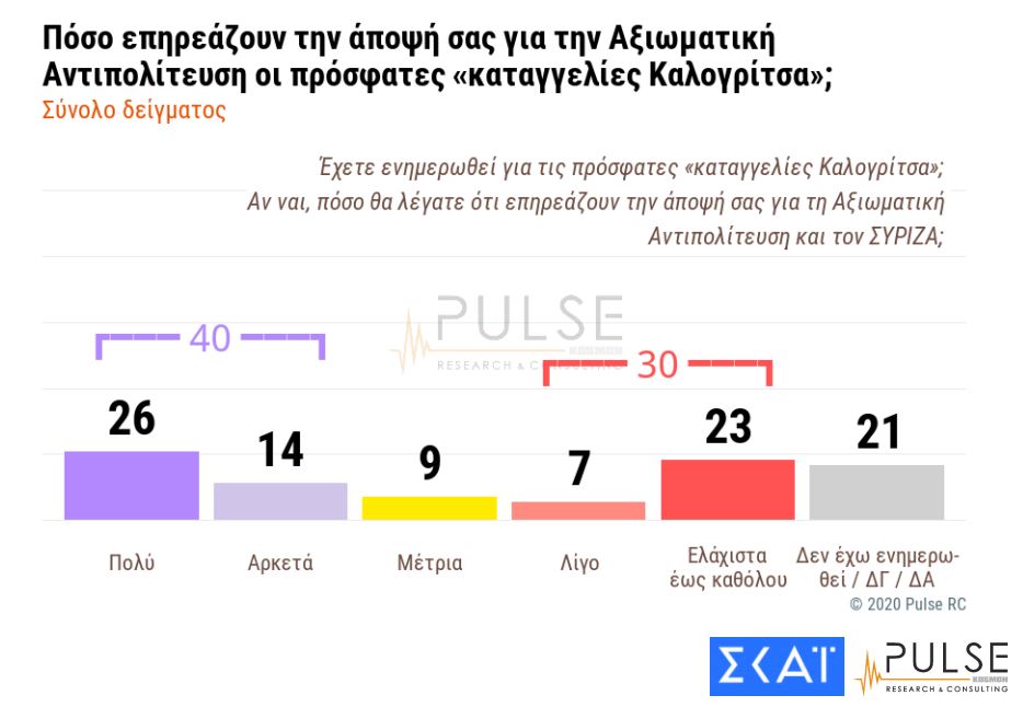 Η υπόθεση με τις καταγγελίες του εργολάβου Χρήστου Καλογρίτσα για την προηγούμενη κυβέρνηση με αιχμή τον Νίκο Παππά, φαίνεται πως έχει πλήξει την εικόνα του ΣΥΡΙΖΑ. Πιο συγκεκριμένα, το 40% των ερωτηθέντων απαντά ότι οι πρόσφατες καταγγελίες Καλογρίτσα έχουν επηρεάσει πολύ ή αρκετά την άποψή τους για την αξιωματική αντιπολίτευση, έναντι 30% που απαντά ότι επηρεάστηκε ελάχιστα ή καθόλου. Το 21% των ερωτηθέντων απάντησε πως δεν έχει ενημερωθεί για την υπόθεση.
