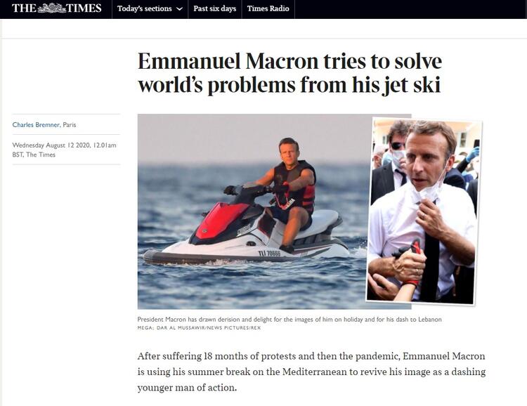 «Ενώ το Ορούτς Ρέις, συνεχίζει την πρόοδό του στην ανατολική Μεσόγειο, χωρίς να δίνει εξηγήσεις, ο Γάλλος πρόεδρος Μακρόν ξεπέρασε και πάλι το όριο κατά της Τουρκίας» γράφει η τουρκική Ηurriyet, αναδημοσιεύοντας το βρετανικό δημοσίευμα με τίτλο: «Ο Μακρόν έχει ξεπεράσει τα όρια κατά της Τουρκίας! Οι Βρετανοί το διασκεδάζουν». Σύμφωνα με το βρετανικό δημοσίευμα, που συνοδεύεται από φωτογραφίες του Γάλλου προέδρου να απολαμβάνει τις καλοκαιρινές του διακοπές κάνοντας jet ski στη Μεσόγειο, ο Μακρόν επιχειρεί ν’ αποδείξει την εικόνα ενός νεαρού και σύγχρονου ηγέτη, παρα τα προβλήματα και την κρίση στη χώρα του μετά και την πανδημία του coovid-19 και στη χώρα του.